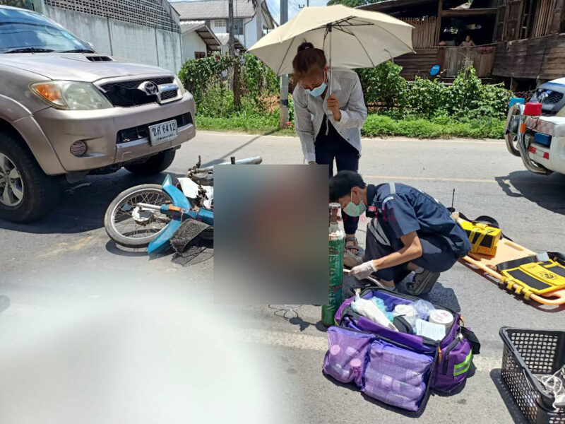 เมื่อวันที่ 31 พฤษภาคม 2564 เวลา 11.43 น.ร.ต.อ.ชวลิต เทรักสี พงส.สภ.เมืองน่าน รับแจ้งจากศูนย์วิทยุ 191 ตำรวจภูธรจังหวัดน่านผ่านศูนย์นนทบุรี แจ้งว่ามีเหตุ รถจักรยานยนต์กับรถยนต์ ที่เกิดเหตุ ถนนสายบ้ายพญาวัด-บ้านเขาน้อย หน้าวัดพญาวัด ตำบลดู่ใต้ อำเภอเมืองน่าน จังหวัดน่าน มีผู้บาดเจ็บจำนวน 1 คน จึงรุดไปตรวจสอบในที่เกิดเหตุพบทีมอุปกรณ์ตัดถ่าง กู้ภัยอบจ.น่าน ทำการตัดเหล็กที่เสียบออก