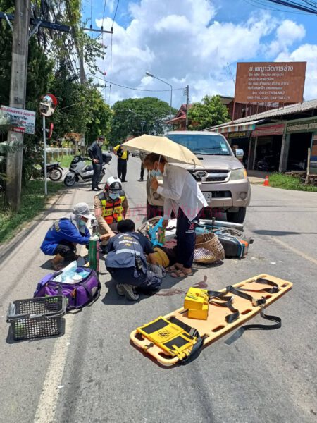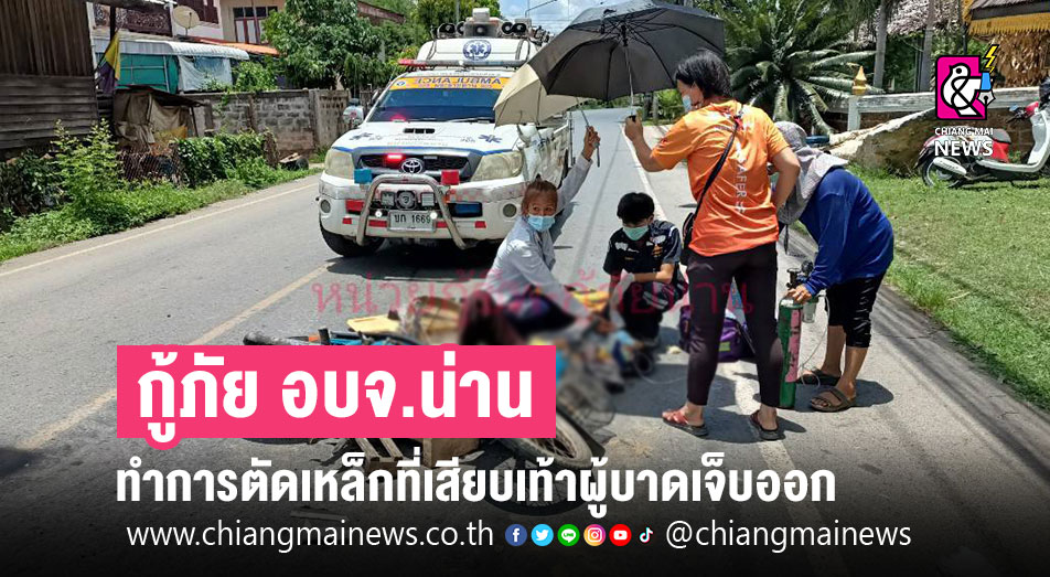 ถูกคันเกียร์รถเสียบบริเวณข้อเท้าซ้ายทะลุ โดยชุดปฏิบัติการฉุกเฉินการแพทย์ทำการปฐมพยาบาลช่วยเหลือ ณ จุดเกิดเหตุ รถกู้ชีพนครน่าน ได้นำผู้บาดเจ็บส่งโรงพยาบาลน่าน