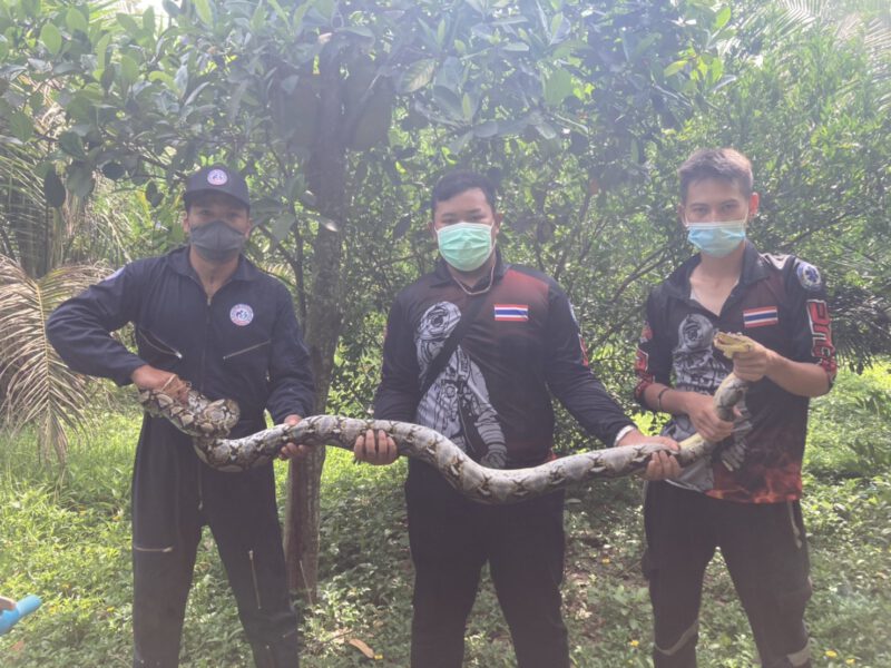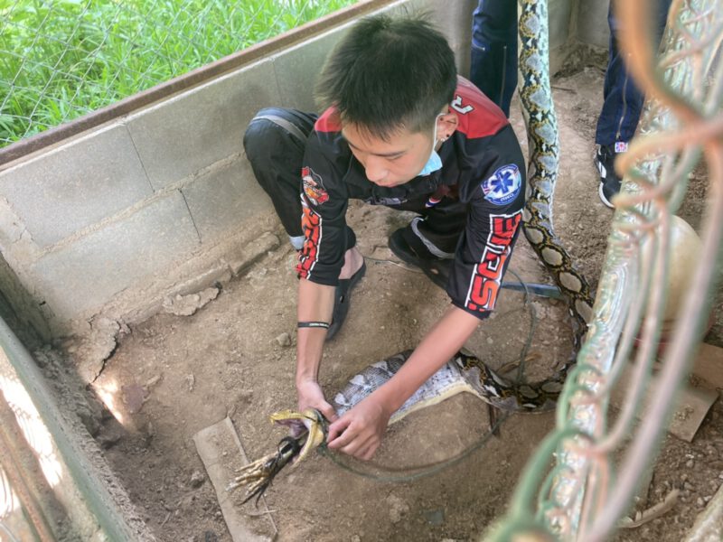 จึงได้แจ้งให้ จนท.ของมูลนิธิพร้อมกับเหยี่ยวฟ้า27 รุดไปให้ความช่วยเหลือ พบว่าเป็นสัตว์เลื้อยคลานประเภทงู (งูเหลือม)กำลังกินไก่ในเล้าไก่ ที่บ้านสวน ได้พร้อมของกลางเป็นไก่ตายแล้วกำลังถูกกลืนเข้าไปในปาก จึงได้ช่วยกันจับและนำปล่อยคืนสู่ธรรมชาติต่อไป