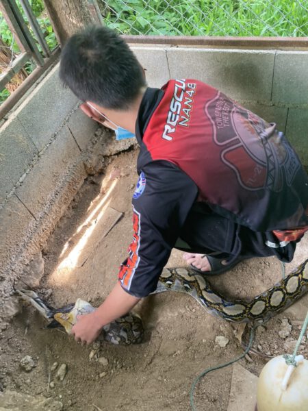 เมื่อวันที่ 24 พฤษภาคม 2564 เวลา 09.00 น. นายทศพรพันธ์ ยอดหงษ์ประธานมูลนิธิเพื่อผู้ยากไร้และศพไร้ญาติจังหวัดน่าน (องค์กรสาธารณะประโยชน์ ) ได้รับแจ้งจากชาวบ้านทึ่ขอความช่วยเหลือที่สัตว์เลื้อยคลานประเภท งู เข้าไปกินไก่ในเล้าที่บ้านสวน