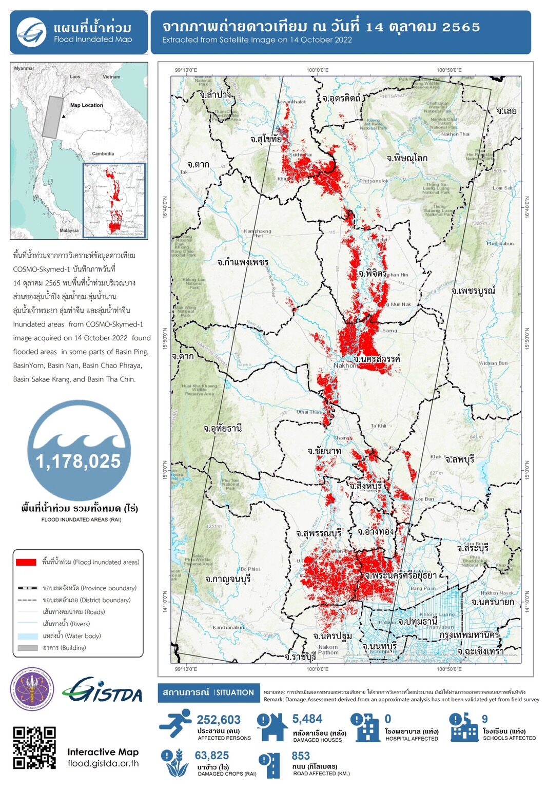 วันที่ 15 ตุลาคม สำนักงานพัฒนาเทคโนโลยีอวกาศและภูมิสารสนเทศ (องค์การมหาชน) GISTDA เผยข้อมูลจากดาวเทียม COSMO-Skymed-1 วันที่ 14 ตุลาคม 2565 แสดงให้เห็นพื้นที่น้ำท่วมขังบางส่วนในเขต ลุ่มน้ำปิง ลุ่มน้ำยม ลุ่มน้ำน่าน ลุ่มน้ำเจ้าพระยา ลุ่มน้ำสะแกกรัง และลุ่มน้ำท่าจีน ทั้งสิ้น 1,178,025 ไร่ ส่วนใหญ่เป็นชุมชนที่อาศัยอยู่ริมน้ำ พื้นที่เกษตรกรรมลุ่มต่ำ และเส้นทางคมนาคมบางส่วน