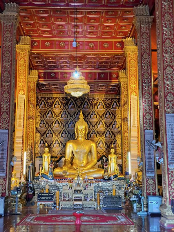 หน้าตักกว้าง 6 ศอก ปิดทองทั้งองค์ มีประวัติความเป็นมาเกี่ยวเนื่องกับประวัติศาสตร์ของเมืองน่าน อีกทั้งยังเป็นที่เคารพนับถือของประชาชนในจังหวัดน่านเป็นอย่างมาก