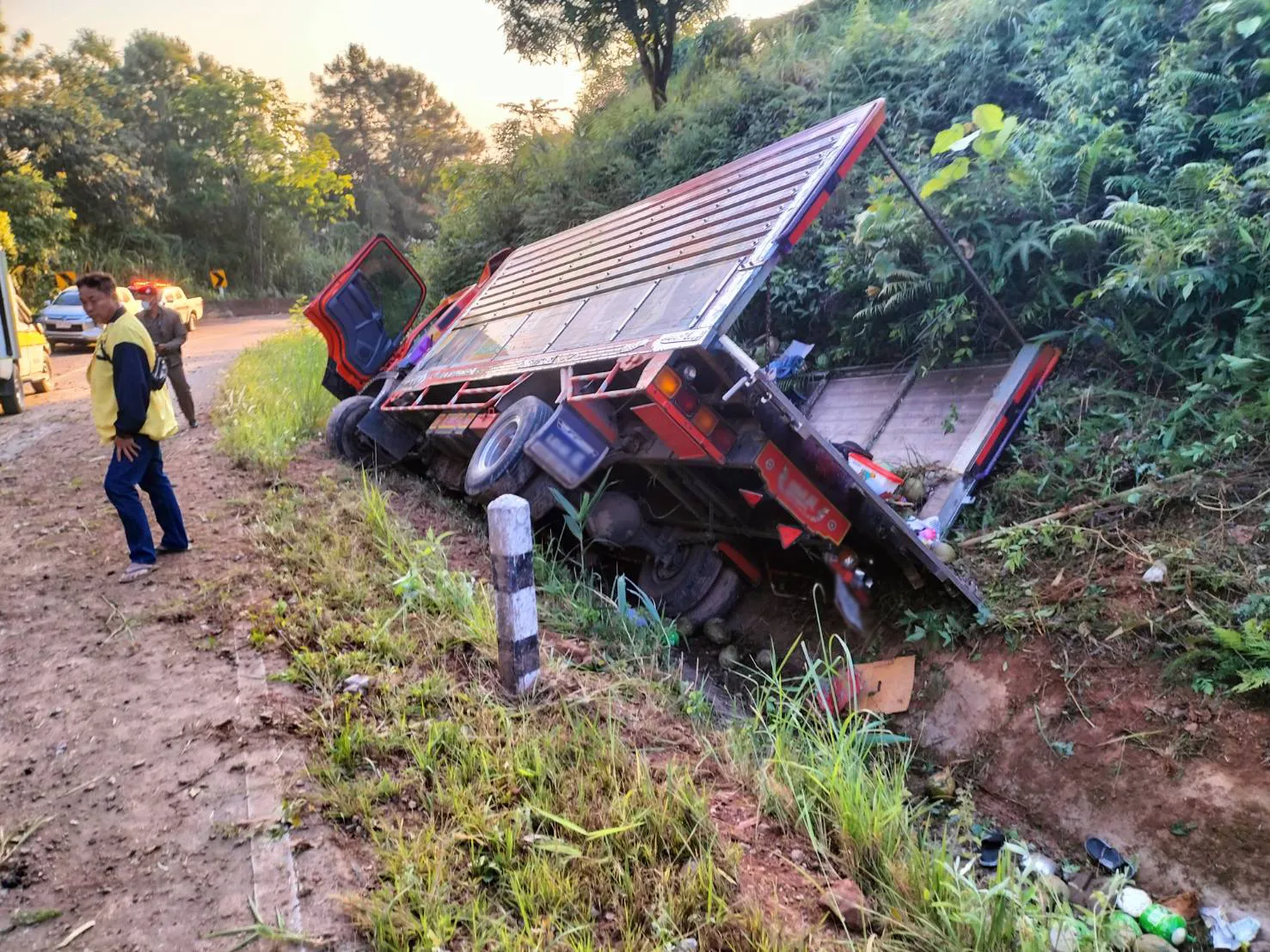 จึงรุดไปตรวจสอบในที่เกิดเหตุพบรถบรรทุก 6 ล้อ ยี่ห้อ Isuzu สีส้ม มีกระบะข้าง ทะเบียน xx-xxxx ราชบุรี