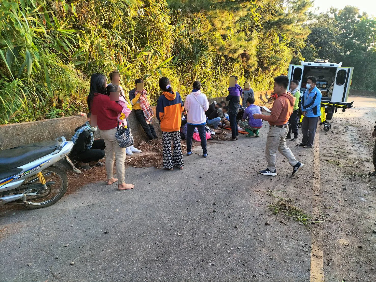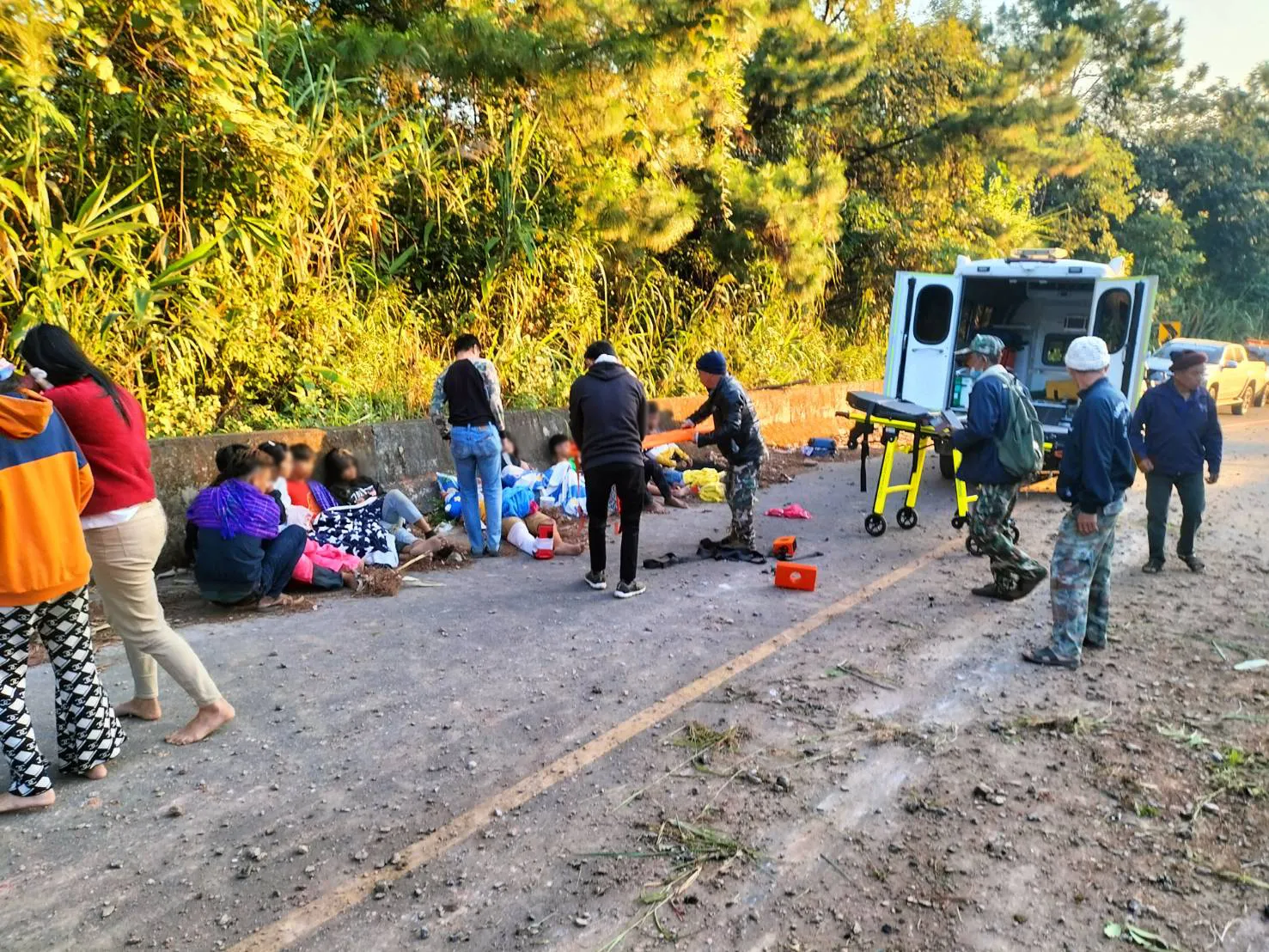 เสียหลักอยู่ในร่องน้ำข้างทางขาลงเขามุ่งหน้า อ.นาน้อย มีผู้ได้รับบาดเจ็บทั้งหมด 20 คน เป็นชาย 11 คน ผู้หญิง 9 คน บาดเจ็บสาหัส 2 คน ชาย 1 หญิง 1 คน โดยมีเจ้าหน้าที่ทีมกู้ชีพกู้ภัย อปท.ในพื้นที่ และหน่วยงานข้างเคียงให้การช่วยเหลือ นำส่งโรงพยาบาลนาน้อย และหมวดทางหลวงนาน้อย อำนวยความสะดวกด้านการจราจร ทำความสะอาดบริเวณที่เกิดเหตุ