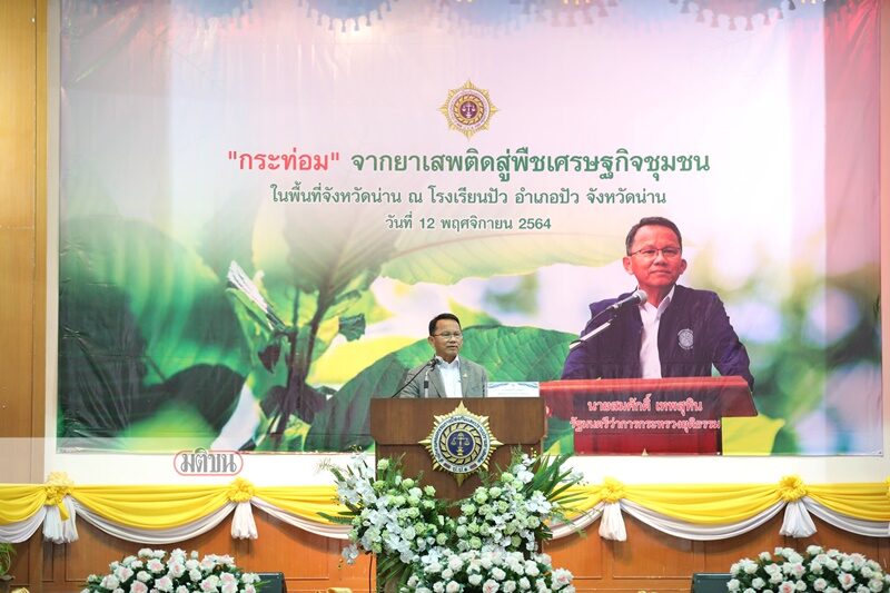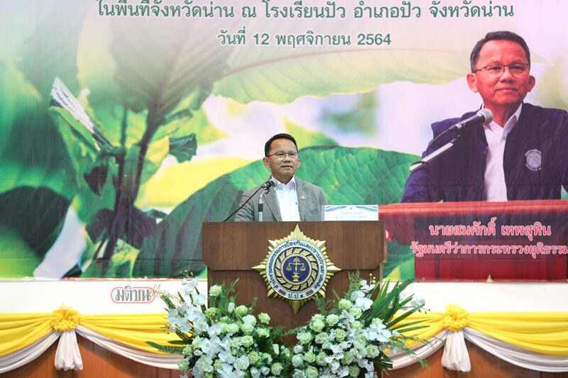 เมื่อเวลา 16.00 น. วันที่ 12 พฤศจิกายน ที่โรงเรียนปัว จ.น่าน นายสมศักดิ์ เทพสุทิน รัฐมนตรีว่าการกระทรวงยุติธรรม เป็นประธานในงาน การสร้างการรับรู้นโยบายพืชกระท่อมสู่เศรษฐกิจชุมชน พร้อมด้วย นายนิวัฒน์ งามธุระ รองผู้ว่าราชการจังหวัดน่าน นายวิศิษฐ์ ทวีสิงห์ ปลัดจังหวัดน่าน พล.ต.ท.ปิยะ ต๊ะวิชัย ผู้บัญชาการตํารวจภูธร ภาค 5 นายวิชัย ไชยมงคล เลขาธิการ ป.ป.ส. นายคุณดร งามธุระ คณะที่ปรึกษา รมว.ยุติธรรม พล.ต.ต.ดุลเดชา อาชวะสมิตตระกูล ผู้บังคับการตํารวจภูธรจังหวัดน่าน นายสมเกียรติ อาจสังข์ นายอําเภอปัว นายประกวด พายัพสถาน ผู้อํานวยการโรงเรียนปัว และประชาชน 700 คนร่วมงาน โดยมีมาตรการตรวจ ATK ทุกคนก่อนเข้างาน