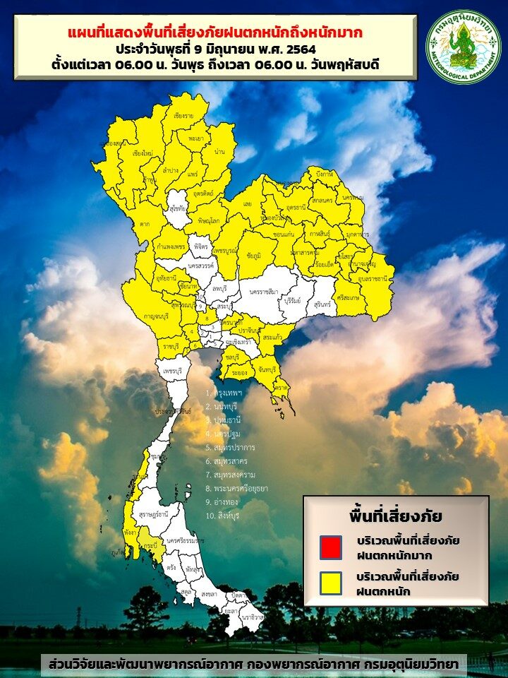 เมื่อวันที่ 9 มิถุนายน กรมอุตุนิยมวิทยา พยากรณ์อากาศ 24 ชั่วโมงข้างหน้า ร่องมรสุมพาดผ่านภาคเหนือตอนบน และตอนบนของภาคตะวันออกเฉียงเหนือ เข้าสู่หย่อมความกดอากาศต่ำบริเวณอ่าวตังเกี๋ย ในขณะที่มรสุมตะวันตกเฉียงใต้กำลังค่อนข้างแรงพัดปกคลุมทะเลอันดามัน ประเทศไทย และอ่าวไทย ลักษณะเช่นนี้ทำให้ประเทศไทยมีฝนฟ้าคะนองกระจาย และมีฝนตกหนักบางแห่งบริเวณภาคเหนือ ภาคตะวันออกเฉียงเหนือ ภาคกลาง ภาคตะวันออก และภาคใต้ฝั่งตะวันตก ขอให้ประชาชนบริเวณดังกล่าวระวังอันตรายจากฝนตกหนักในระยะนี้ไว้ด้วย