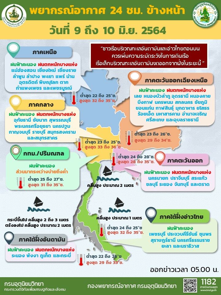 เมื่อวันที่ 9 มิถุนายน กรมอุตุนิยมวิทยา พยากรณ์อากาศ 24 ชั่วโมงข้างหน้า ร่องมรสุมพาดผ่านภาคเหนือตอนบน และตอนบนของภาคตะวันออกเฉียงเหนือ เข้าสู่หย่อมความกดอากาศต่ำบริเวณอ่าวตังเกี๋ย ในขณะที่มรสุมตะวันตกเฉียงใต้กำลังค่อนข้างแรงพัดปกคลุมทะเลอันดามัน ประเทศไทย และอ่าวไทย ลักษณะเช่นนี้ทำให้ประเทศไทยมีฝนฟ้าคะนองกระจาย และมีฝนตกหนักบางแห่งบริเวณภาคเหนือ ภาคตะวันออกเฉียงเหนือ ภาคกลาง ภาคตะวันออก และภาคใต้ฝั่งตะวันตก ขอให้ประชาชนบริเวณดังกล่าวระวังอันตรายจากฝนตกหนักในระยะนี้ไว้ด้วย