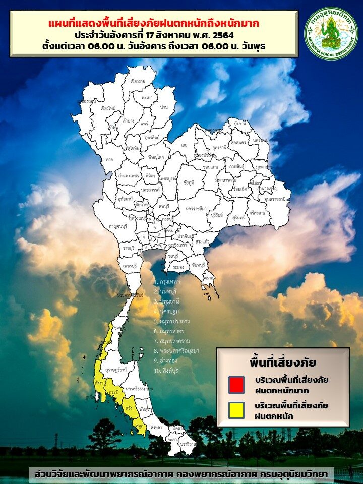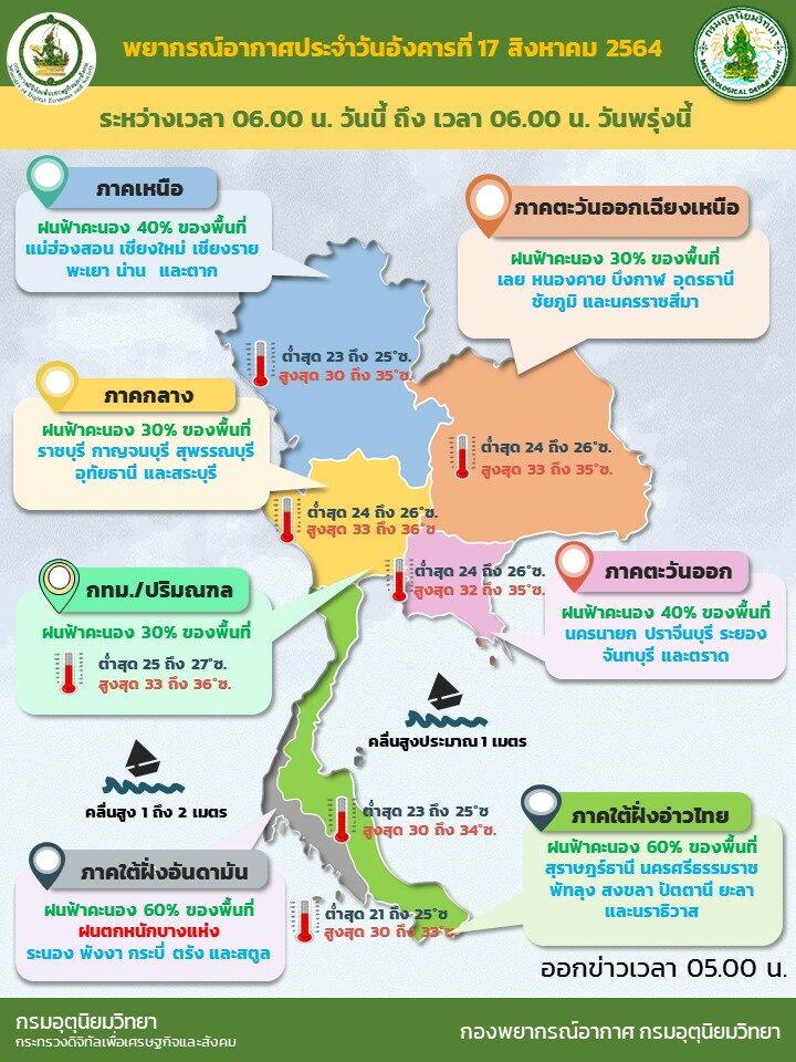 เมื่อวันที่ 17 สิงหาคม กรมอุตุนิยมวิทยา พยากรณ์อากาศ 24 ชั่วโมงข้างหน้า มรสุมตะวันตกเฉียงใต้ที่พัดปกคลุมทะเลอันดามัน ประเทศไทย และอ่าวไทย เริ่มมีกำลังอ่อนลง ในขณะที่หย่อมความกดอากาศต่ำยังคงปกคลุมประเทศเวียดนามตอนบน ลักษณะเช่นนี้ทำให้ประเทศไทยมีฝนฟ้าคะนองเกิดขึ้น และมีฝนตกหนักบางแห่งในภาคใต้ฝั่งตะวันตก ขอให้ประชาชนบริเวณพื้นที่เสี่ยงภัยดังกล่าว ระวังอันตรายจากฝนตกหนักและฝนที่ตกสะสม ซึ่งอาจทำให้เกิดน้ำท่วมฉับพลันและน้ำป่าไหลหลากได้